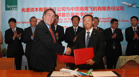 中國經(jīng)濟網(wǎng)訊 2012年7月10日,范堡羅航展第二天,中國商飛公司與光譜資本有限責(zé)任公司(以下簡稱光譜公司)在英國倫敦簽署諒解備忘錄。