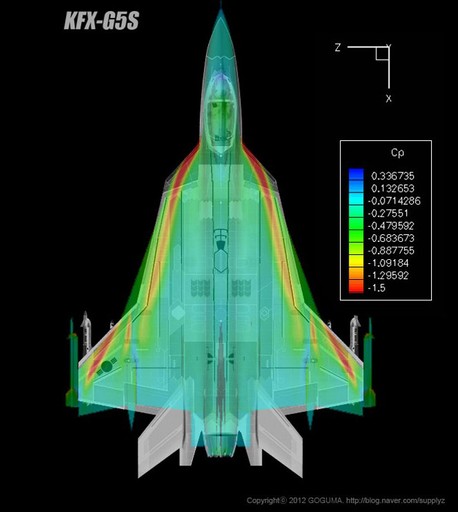 KFX有正常式布局的101方案和鴨式布局的201方案。KFX-101外形上類似于F-22,尺寸略小,采用了DSI進氣口設計,近乎于一種F-35的雙發(fā)型;另一種則為KFX-201,采用了鴨式布局并列雙發(fā)外傾式雙垂尾設計。飛機的前翼、主翼以及垂直尾翼均為梯形,前緣后掠角稍大而后緣前掠角較小,均互相平行。前翼沒有上反角,而且與主翼在同一平面上而不是高于主翼。尾翼設計也很普通,直接安裝在機身上的兩個外傾式垂直尾翼完全起不到對噴口紅外特征的遮擋作用。而且過于靠前、靠內的垂直尾翼在飛機大迎角飛行時完全被其機身和主翼的遮蔽。比較特別的是,為了保證對地面雷達的低可探測性,KFX-201的機頭為帶棱角的五邊棱錐。