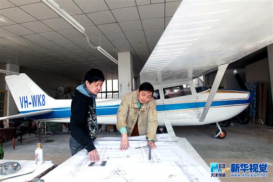 3月20日,模型設計家曹珉(右)和李志剛(左)在研究飛機模型圖紙
