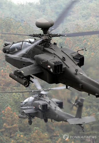 資料圖片:正在進(jìn)行訓(xùn)練的駐韓美軍的阿帕奇直升機(jī)(韓聯(lián)社)