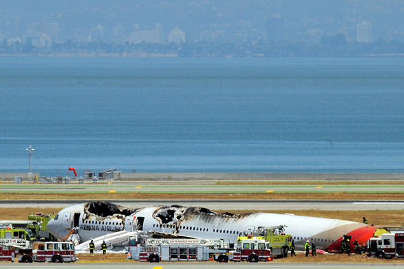 2013年7月6日,在美國舊金山國際機場,救援人員在發(fā)生事故的波音777飛機旁工作。