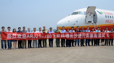 中國(guó)經(jīng)濟(jì)網(wǎng)航空訊 據(jù)中國(guó)商飛公司報(bào)道,2013年7月15日上午10時(shí)19分,ARJ21-700飛機(jī)103架機(jī)從閻良中國(guó)試飛院機(jī)場(chǎng)起飛,由試飛員劉宏亮、郭寶駕機(jī),經(jīng)過1小時(shí)38分的轉(zhuǎn)場(chǎng)飛行,于11時(shí)57分順利抵達(dá)長(zhǎng)沙,標(biāo)志著2013年高溫高濕試飛正式拉開帷幕。按照計(jì)劃,103架機(jī)將進(jìn)行環(huán)控、液壓等系統(tǒng)相關(guān)科目的試飛和地面試驗(yàn)。