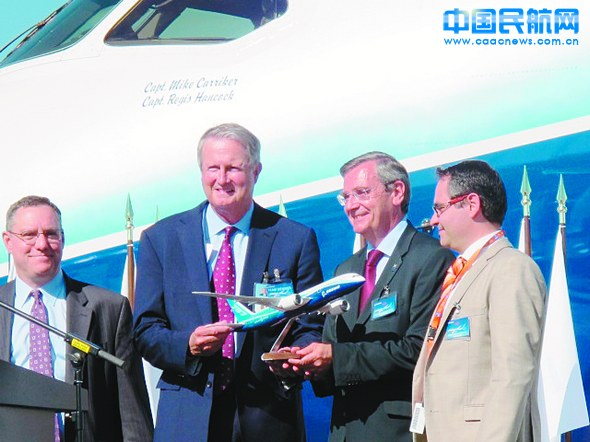 去年8月26日,波音獲頒波音787型號生產(chǎn)認(rèn)證證書后,安波杰(左二)向歐洲安全局局長(右二)贈送波音787模型。 (劉樹國/攝)