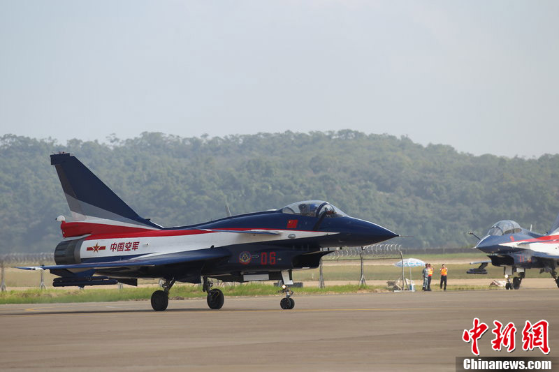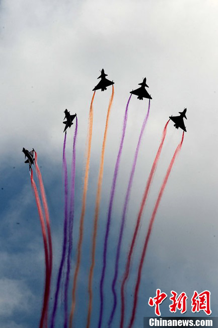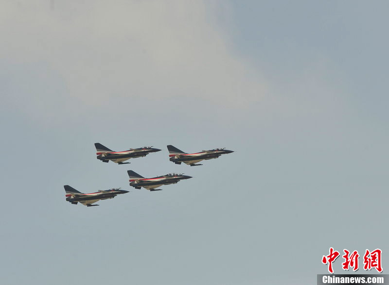 2012年11月10日,廣東省珠海市,八一飛行表演隊殲十戰(zhàn)機做編隊飛行練習(xí)。八一飛行表演隊將在珠海航展上做精彩編隊飛行表演。
