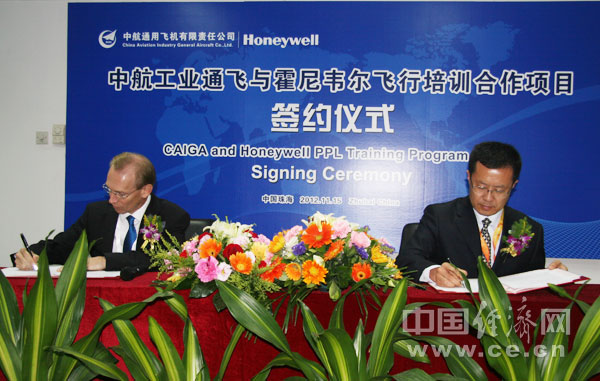 中國經(jīng)濟網(wǎng)珠海航展特派記者團 記者王飛11月16日報道 15日,中航通用飛機有限責(zé)任公司(以下簡稱“中航工業(yè)通飛”)副總經(jīng)理、珠海中航飛行學(xué)校有限公司董事長沙長安與霍尼韋爾航空航天(簡稱“霍尼韋爾公司”)亞太區(qū)總裁Briand Greer簽署了“飛機5用駕駛員駕照(PPL)項目合作備忘錄”。這標志著中航工業(yè)通飛下屬的珠海中航飛行學(xué)校向霍尼韋爾公司的工程技術(shù)人員和管理人員提供飛行培訓(xùn)服務(wù)的工作進入實施階段。