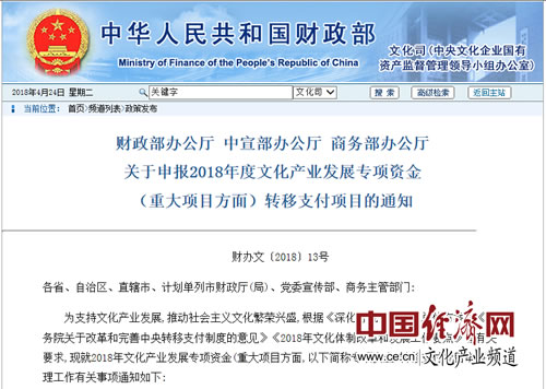 經(jīng)濟(jì)日?qǐng)?bào)-中國經(jīng)濟(jì)網(wǎng)北京4月24日訊 近日,財(cái)政部辦公廳、中宣部辦公廳和商務(wù)部辦公廳聯(lián)合下發(fā)了關(guān)于申報(bào)2018年度文化產(chǎn)業(yè)發(fā)展專項(xiàng)資金(重大項(xiàng)目方面)轉(zhuǎn)移支付項(xiàng)目的通知(以下簡(jiǎn)稱“通知”)。根據(jù)通知,專項(xiàng)資金將直接補(bǔ)助推動(dòng)影視產(chǎn)業(yè)發(fā)展和對(duì)外文化貿(mào)易發(fā)展的重大項(xiàng)目。