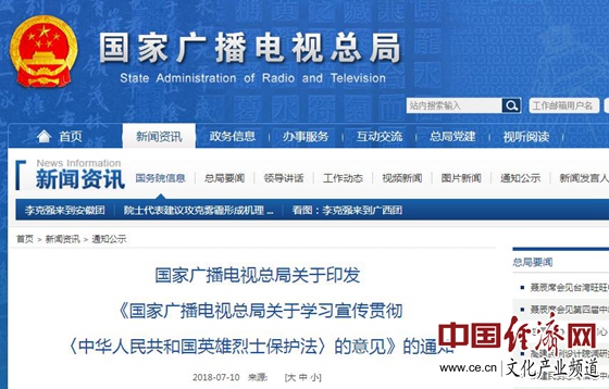 經(jīng)濟(jì)日?qǐng)?bào)-中國(guó)經(jīng)濟(jì)網(wǎng)北京7月11日訊 近日,國(guó)家廣播電視總局印發(fā)《國(guó)家廣播電視總局關(guān)于學(xué)習(xí)宣傳貫徹〈中華人民共和國(guó)英雄烈士保護(hù)法〉的意見》(以下簡(jiǎn)稱《意見》)的通知。《意見》指出:鼓勵(lì)和支持廣播電視播出機(jī)構(gòu)、信息網(wǎng)絡(luò)視聽節(jié)目服務(wù)單位、廣播電視節(jié)目制作經(jīng)營(yíng)機(jī)構(gòu)等創(chuàng)作以英雄烈士事跡為題材、弘揚(yáng)英雄烈士精神的專題片、紀(jì)錄片、訪談節(jié)目、綜藝節(jié)目、電視劇、網(wǎng)絡(luò)視聽節(jié)目等;鼓勵(lì)英雄烈士題材的劇目積極申報(bào)電視劇選題規(guī)劃、網(wǎng)絡(luò)原創(chuàng)視聽節(jié)目規(guī)劃。