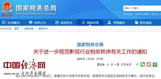 經(jīng)濟(jì)日?qǐng)?bào)-中國(guó)經(jīng)濟(jì)網(wǎng)10月8日訊 記者從國(guó)家稅務(wù)總局網(wǎng)站獲悉,10月2日,國(guó)家稅務(wù)總局下發(fā)《國(guó)家稅務(wù)總局關(guān)于進(jìn)一步規(guī)范影視行業(yè)稅收秩序有關(guān)工作的通知》(以下簡(jiǎn)稱“《通知》”),進(jìn)一步部署開(kāi)展規(guī)范影視行業(yè)稅收秩序工作。