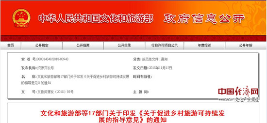 經(jīng)濟(jì)日?qǐng)?bào)-中國(guó)經(jīng)濟(jì)網(wǎng)北京12月11日訊 為深入貫徹落實(shí)《中共中央 國(guó)務(wù)院關(guān)于實(shí)施鄉(xiāng)村振興戰(zhàn)略的意見》(中發(fā)〔2018〕1號(hào))和《鄉(xiāng)村振興戰(zhàn)略規(guī)劃(2018-2022年)》,推動(dòng)鄉(xiāng)村旅游提質(zhì)增效,促進(jìn)鄉(xiāng)村旅游可持續(xù)發(fā)展,加快形成農(nóng)業(yè)農(nóng)村發(fā)展新動(dòng)能,近日文化和旅游部等17部門聯(lián)合印發(fā)《關(guān)于促進(jìn)鄉(xiāng)村旅游可持續(xù)發(fā)展的指導(dǎo)意見》(以下簡(jiǎn)稱《意見》),《意見》提出,到2022年,旅游基礎(chǔ)設(shè)施和公共服務(wù)設(shè)施進(jìn)一步完善,鄉(xiāng)村旅游服務(wù)質(zhì)量和水平全面提升,富農(nóng)惠農(nóng)作用更加凸顯,基本形成布局合理、類型多樣、功能完善、特色突出的鄉(xiāng)村旅游發(fā)展格局。