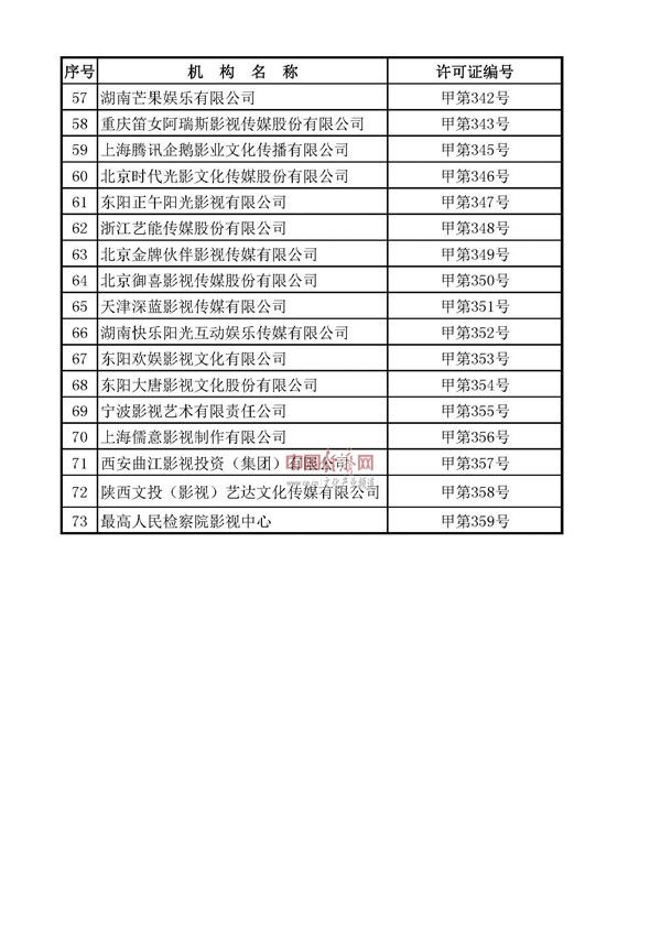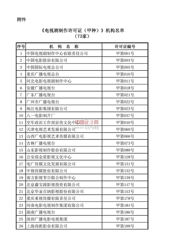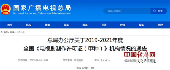 經(jīng)濟日報-中國經(jīng)濟網(wǎng)北京7月30日訊 日前,廣電總局公布2019-2021年度《電視劇制作許可證(甲種)》機構(gòu)名單。中國電視劇制作中心有限公司、中國電影股份有限公司、中國國際電視總公司等73家機構(gòu)入選。