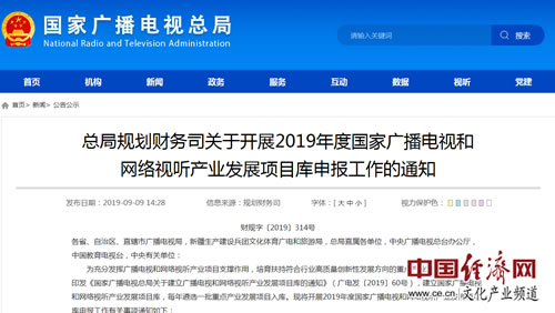 經(jīng)濟(jì)日報-中國經(jīng)濟(jì)網(wǎng)北京9月10日訊 日前,國家廣播電視總局發(fā)布了關(guān)于開展2019年度國家廣播電視和網(wǎng)絡(luò)視聽產(chǎn)業(yè)發(fā)展項目庫申報工作的通知。通知表明,為充分發(fā)揮廣播電視和網(wǎng)絡(luò)視聽產(chǎn)業(yè)項目支撐作用,培育扶持符合行業(yè)高質(zhì)量創(chuàng)新性發(fā)展方向的重點產(chǎn)業(yè)發(fā)展項目,國家廣播電視總局印發(fā)《國家廣播電視總局關(guān)于建立廣播電視和網(wǎng)絡(luò)視聽產(chǎn)業(yè)發(fā)展項目庫的通知》(廣電發(fā)〔2019〕60號),建立國家廣播電視和網(wǎng)絡(luò)視聽產(chǎn)業(yè)發(fā)展項目庫,每年遴選一批重點產(chǎn)業(yè)發(fā)展項目入庫。