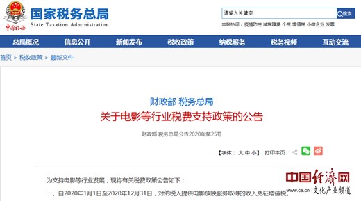 經(jīng)濟(jì)日?qǐng)?bào)-中國(guó)經(jīng)濟(jì)網(wǎng)北京5月20日訊 近日,國(guó)家稅務(wù)總局官網(wǎng)發(fā)布《關(guān)于電影等行業(yè)稅費(fèi)支持政策的公告》(以下簡(jiǎn)稱《公告》),支持電影等行業(yè)發(fā)展。