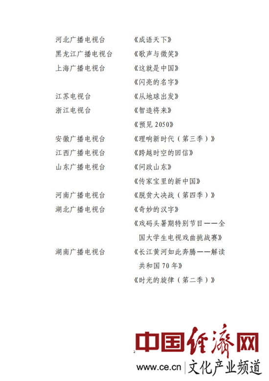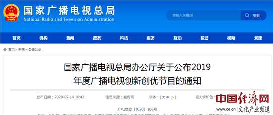 經(jīng)濟日報-中國經(jīng)濟網(wǎng)北京7月15日訊 7月14日,國家廣播電視總局公布了2019年度廣播電視創(chuàng)新創(chuàng)優(yōu)節(jié)目。