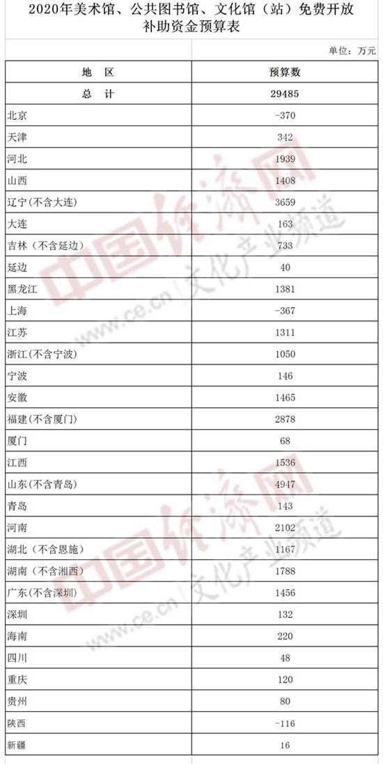 經(jīng)濟日報-中國經(jīng)濟網(wǎng)北京8月4日訊 8月4日,財政部官網(wǎng)發(fā)布了《關于下達2020年美術館、公共圖書館、文化館(站)免費開放補助資金預算的通知》(以下簡稱“通知”),據(jù)通知附件《2020年美術館、公共圖書館、文化館(站)免費開放補助資金預算表》顯示,2020年美術館、公共圖書館、文化館(站)免費開放補助資金預算為2.9485億。