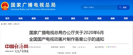 經(jīng)濟(jì)日?qǐng)?bào)-中國(guó)經(jīng)濟(jì)網(wǎng)北京8月5日訊 中國(guó)經(jīng)濟(jì)網(wǎng)文化產(chǎn)業(yè)頻道記者從國(guó)家廣播電視總局官網(wǎng)獲悉,《國(guó)家廣播電視總局辦公廳關(guān)于2020年6月全國(guó)國(guó)產(chǎn)電視動(dòng)畫(huà)片制作備案公示的通知》(簡(jiǎn)稱(chēng)《通知》)于4日發(fā)布?!锻ㄖ访鞔_,2020年6月,經(jīng)備案公示的全國(guó)國(guó)產(chǎn)電視動(dòng)畫(huà)片為53部,19934分鐘。