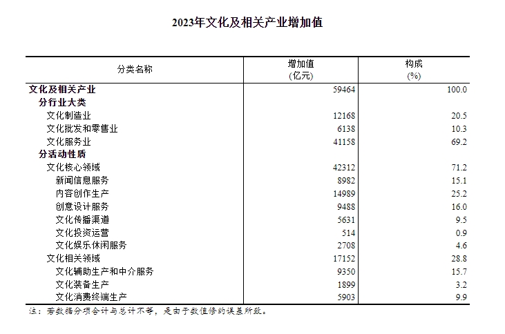 分領(lǐng)域看,2023年,文化核心領(lǐng)域增加值為42312億元,占文化及相關(guān)產(chǎn)業(yè)增加值的比重為71.2%;文化相關(guān)領(lǐng)域增加值為17152億元,占比為28.8%。
