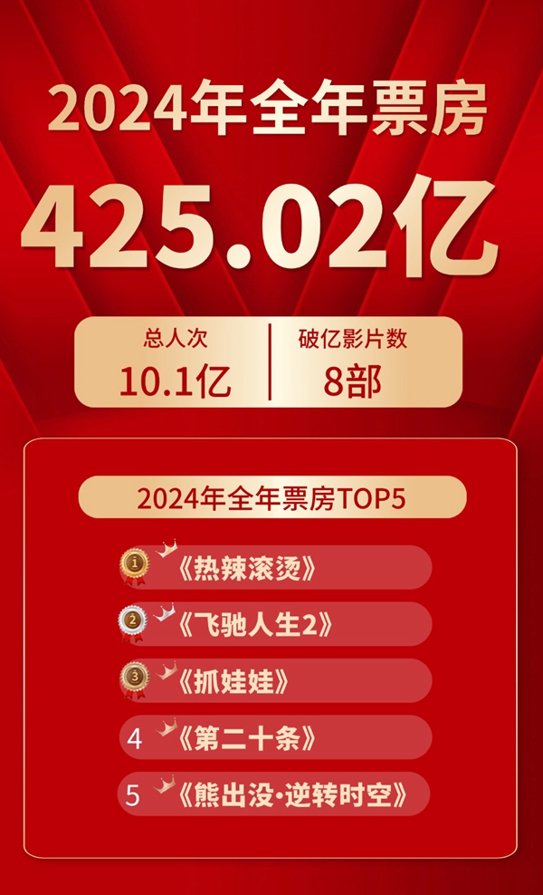 據(jù)貓眼專業(yè)版數(shù)據(jù),2024年全年共有8部影片破10億,年度票房冠軍為春節(jié)檔影片《熱辣滾燙》,全年大盤占比為8.1%。年度TOP10影片分別為《熱辣滾燙》《飛馳人生2》《抓娃娃》《第二十條》《熊出沒·逆轉(zhuǎn)時(shí)空》《默殺》《志愿軍:存亡之戰(zhàn)》《年會(huì)不能停!》《哥斯拉大戰(zhàn)金剛2:帝國(guó)崛起》《你想活出怎樣的人生》,其中,國(guó)產(chǎn)片占據(jù)八席,進(jìn)口片占據(jù)兩席,涵蓋類型包括喜劇、劇情、犯罪、戰(zhàn)爭(zhēng)、動(dòng)作、動(dòng)畫等。整體看來(lái),2024年電影市場(chǎng)仍呈現(xiàn)出較強(qiáng)的韌性和上升空間。