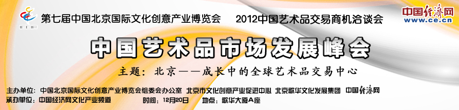 目前,北京藝術(shù)品市場(chǎng)在全球格局中將處于怎樣的定位?藝術(shù)品的稅收問題如何解決?中國藝術(shù)品經(jīng)營及研究機(jī)構(gòu)面臨哪些機(jī)遇和挑戰(zhàn)?文化保稅區(qū)的政策優(yōu)勢(shì)如何能促進(jìn)北京藝術(shù)品交易市場(chǎng)的發(fā)展?作為2012第七屆中國北京國際文化創(chuàng)意產(chǎn)業(yè)博覽會(huì)重要的活動(dòng)之一,由北京文化創(chuàng)意產(chǎn)業(yè)促進(jìn)中心、北京歌華文化發(fā)展集團(tuán)和中國經(jīng)濟(jì)網(wǎng)共同主辦,中國經(jīng)濟(jì)網(wǎng)文化產(chǎn)業(yè)頻道承辦的“2012中國藝術(shù)品市場(chǎng)發(fā)展峰會(huì)”將于12月在北京舉行,特邀請(qǐng)政府相關(guān)部門及各方人士針對(duì)目前北京藝術(shù)品市場(chǎng)發(fā)展現(xiàn)狀和發(fā)展趨勢(shì)進(jìn)行直接的交流對(duì)話。