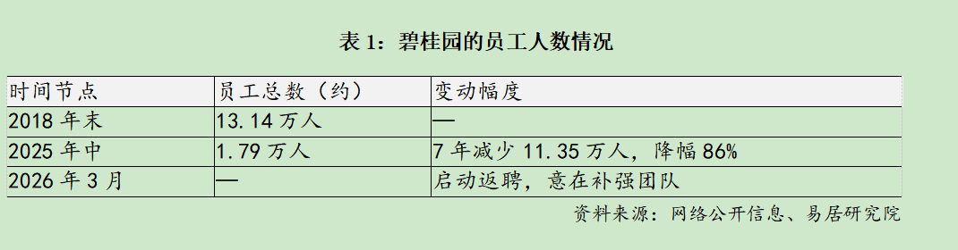 據(jù)嚴躍進分析,碧桂園此次啟動大規(guī)模返聘,是其經(jīng)歷深度調(diào)整后,經(jīng)營重心發(fā)生實質(zhì)性轉(zhuǎn)變的明確信號。公開數(shù)據(jù)顯示,公司員工總數(shù)已從2018年末的約13萬人銳減至去年底的約2萬人,減員幅度超過80%。這一數(shù)據(jù)直觀地反映出,在過去幾年的行業(yè)深度調(diào)整期,企業(yè)為求生存不得不采取極致的縮表策略與降本增效措施。本質(zhì)上,這背后折射出的,是房企出險后經(jīng)營秩序被徹底打破的現(xiàn)實困境。