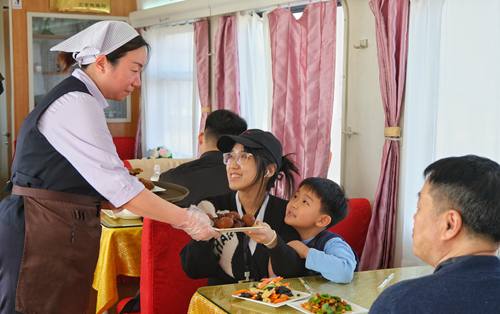 春運(yùn)首日鐵路天津客運(yùn)段值乘的T253次列車上餐車服務(wù)人員正在為旅客提供用餐服務(wù)。(楊寶森/攝)