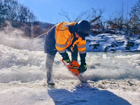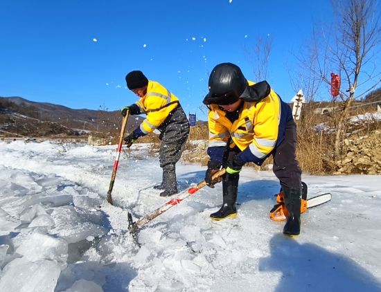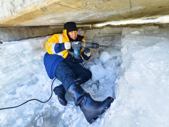 2月初的北方山區(qū),寒風(fēng)呼嘯,風(fēng)力達五級,氣溫逼近零下20攝氏度。職工們手持油鋸、電鎬破開冰層,由于橋下空間有限,職工們有時需要半跪或是半躺式,一層層的進行破冰,然后再用鐵鍬將碎冰鏟至河道兩側(cè)。冰水混合物不斷濺到身上,迅速凝結(jié)成冰,不到半小時,許多人外套已覆上一層白霜,成了名副其實的“冰人”。然而無人停歇,破冰動作穩(wěn)健而持續(xù)。