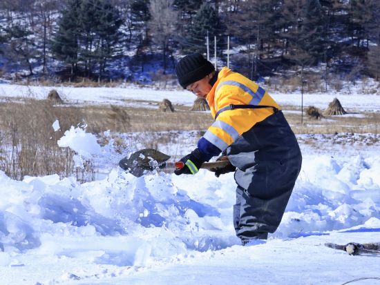 “注意寬度和深度,把握好尺寸!”現(xiàn)場負責(zé)人羅軍一邊測量冰槽尺寸,一邊提醒作業(yè)人員。使用油鋸開鑿導(dǎo)流水道時,寬度必須精準:過窄則排水不暢,過寬則水流速緩,易重新凍結(jié)。每次作業(yè),羅軍都會嚴格把關(guān),確保導(dǎo)流槽既有效又持久。