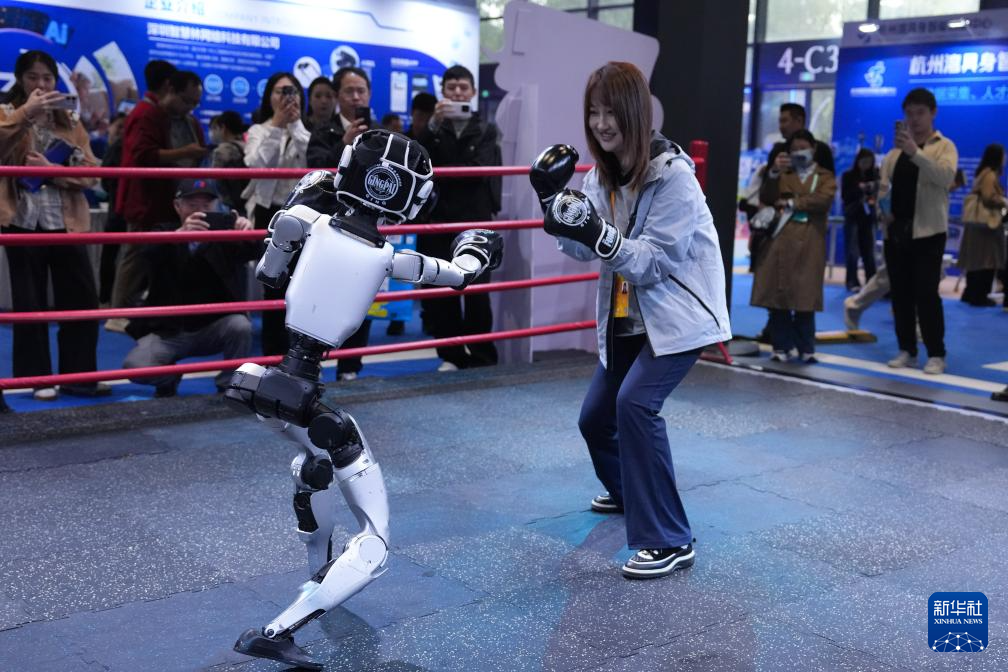 11月6日,觀眾在2025年世界互聯(lián)網(wǎng)大會(huì)“互聯(lián)網(wǎng)之光”博覽會(huì)現(xiàn)場體驗(yàn)與宇樹科技G1機(jī)器人“格斗”。新華社記者 黃宗治 攝