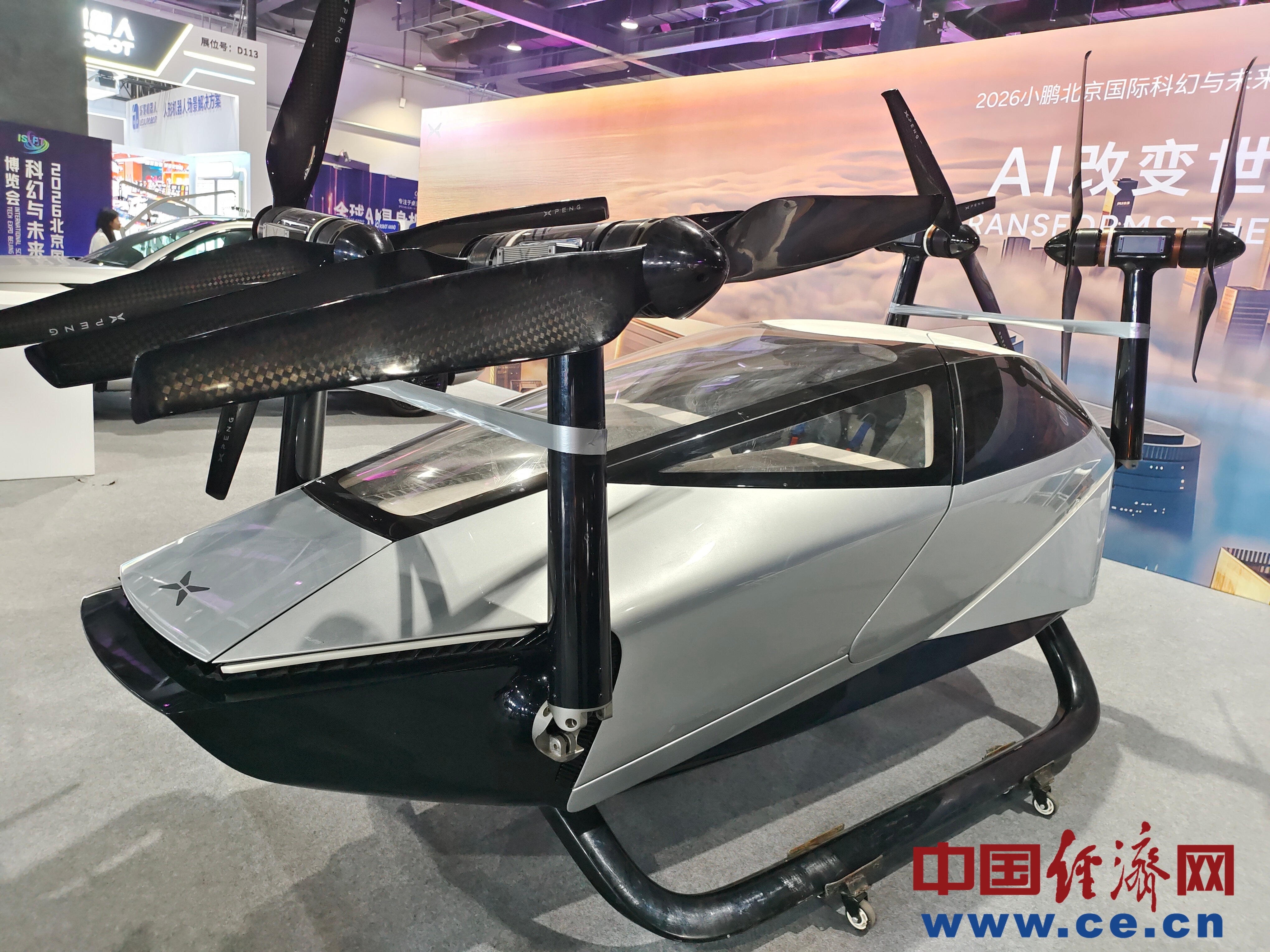 2026北京國際科幻與未來產(chǎn)業(yè)博覽會上展示的小鵬A868全傾轉(zhuǎn)混電飛行汽車。中國經(jīng)濟(jì)網(wǎng)記者 朱曉倩/攝