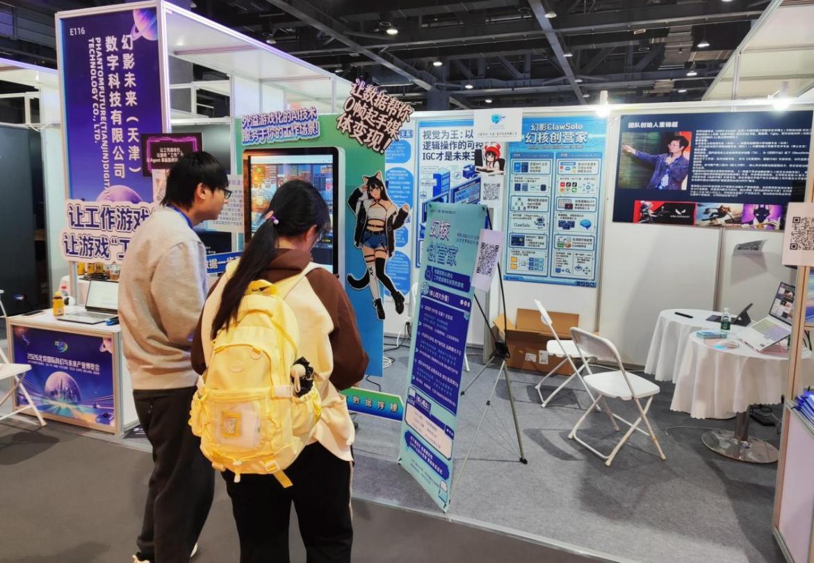 展館內(nèi),幻影未來(lái)(天津)數(shù)字科技有限公司的展位上顯示著像素風(fēng)格的辦公室界面,吸引著觀眾駐足?!拔覀兪褂脭?shù)字人和像素風(fēng)辦公室界面作為前端,讓用戶和Agent互動(dòng)更為直接簡(jiǎn)單,真正實(shí)現(xiàn)‘工作變得像游戲一樣簡(jiǎn)單’。”董錦超介紹,幻影未來(lái)是一家游戲與動(dòng)畫(huà)垂類的技術(shù)型“OPC”,目前專注于AI Agent智能體技術(shù)自動(dòng)化應(yīng)用,包含影視動(dòng)畫(huà)、游戲交互、泛娛樂(lè)等,今年主打的核心產(chǎn)品是面向C端和小B端的ClawSolo項(xiàng)目。董錦超透露,除該項(xiàng)目外,他們深耕游戲和動(dòng)畫(huà)垂類,與一些大廠達(dá)成長(zhǎng)期合作開(kāi)發(fā),與AI短劇平臺(tái)做聯(lián)合出品和制片任務(wù)。