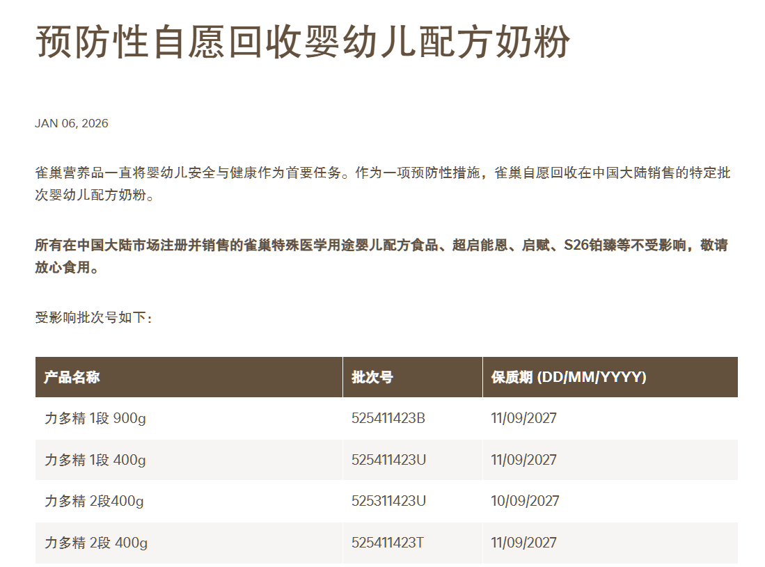 1月6日,雀巢大中華區(qū)官方網(wǎng)站發(fā)布兩則《預(yù)防性自愿回收嬰幼兒配方奶粉》公告。一份公告針對在中國大陸銷售的特定批次嬰幼兒配方奶粉,涉及力多精、鉑初能恩、舒宜能恩以及惠氏膳兒加兒童成長奶粉等30批次產(chǎn)品。另一份公告則針對所有此次涉事的進(jìn)口自歐洲、在中國大陸跨境電商渠道銷售的嬰幼兒配方奶粉,涉及“Nestlé BEBA Supreme”“惠氏Wyeth啟賦未來”等41批次產(chǎn)品。