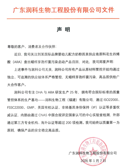 同日,廣東潤科生物工程股份有限公司也發(fā)布聲明稱,召回事件與潤科公司無關(guān),潤科公司所有產(chǎn)品從原材料管控開始均通過獨立、可追溯的供應(yīng)鏈體系嚴(yán)格管控,無蠟樣芽孢桿菌污染。