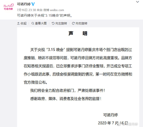 昨日晚間,可諾丹婷針對 315 晚會報道作出回應??芍Z丹婷表示,關(guān)于央視“3.15晚會”提到可諾丹婷重慶市場個別門店出現(xiàn)的過度推銷、培訓不規(guī)范等問題,可諾丹婷品牌方對此高度重視。品牌方在知悉相關(guān)報道后,已立即要求涉事門店停業(yè)整頓,并已成立專項工作小組跟進此事,后續(xù)會根據(jù)調(diào)查到的情況,第一時間在官方微博和官方微信公布。