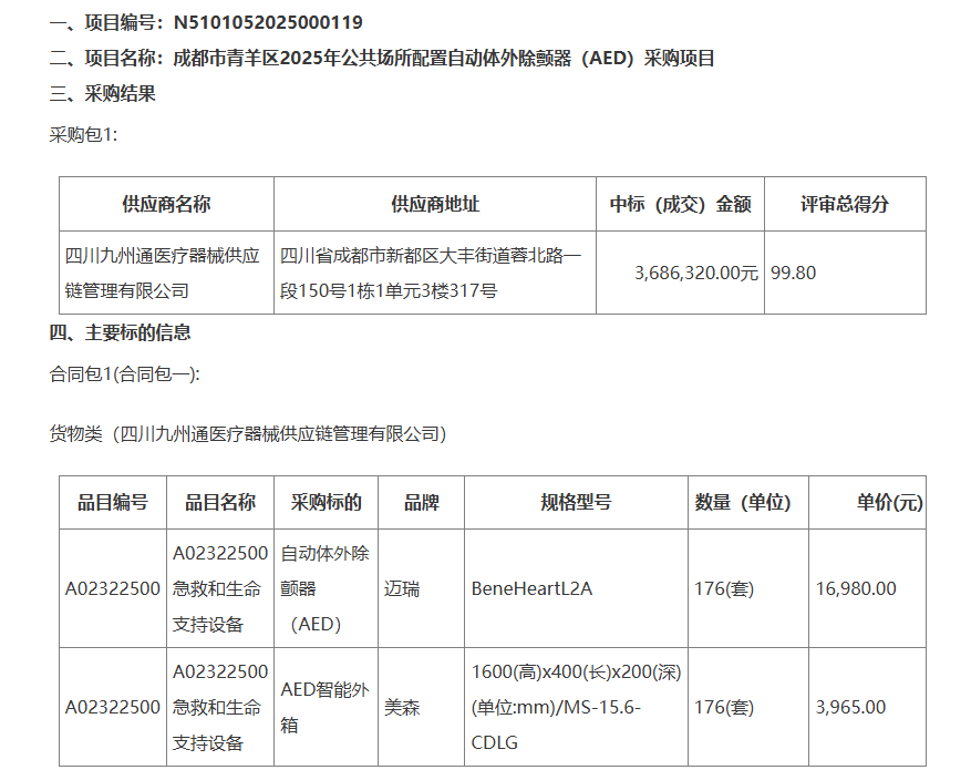 公告顯示,四川九州通醫(yī)療器械供應(yīng)鏈管理有限公司以99.80的評(píng)審總得分中標(biāo),中標(biāo)(成交)金額為3686320.00元,將供應(yīng)176(套)邁瑞公司的自動(dòng)體外除顫器(AED),單價(jià)為16980.00元;供應(yīng)176(套)美森公司的AED智能外箱,單價(jià)為3965.00元。