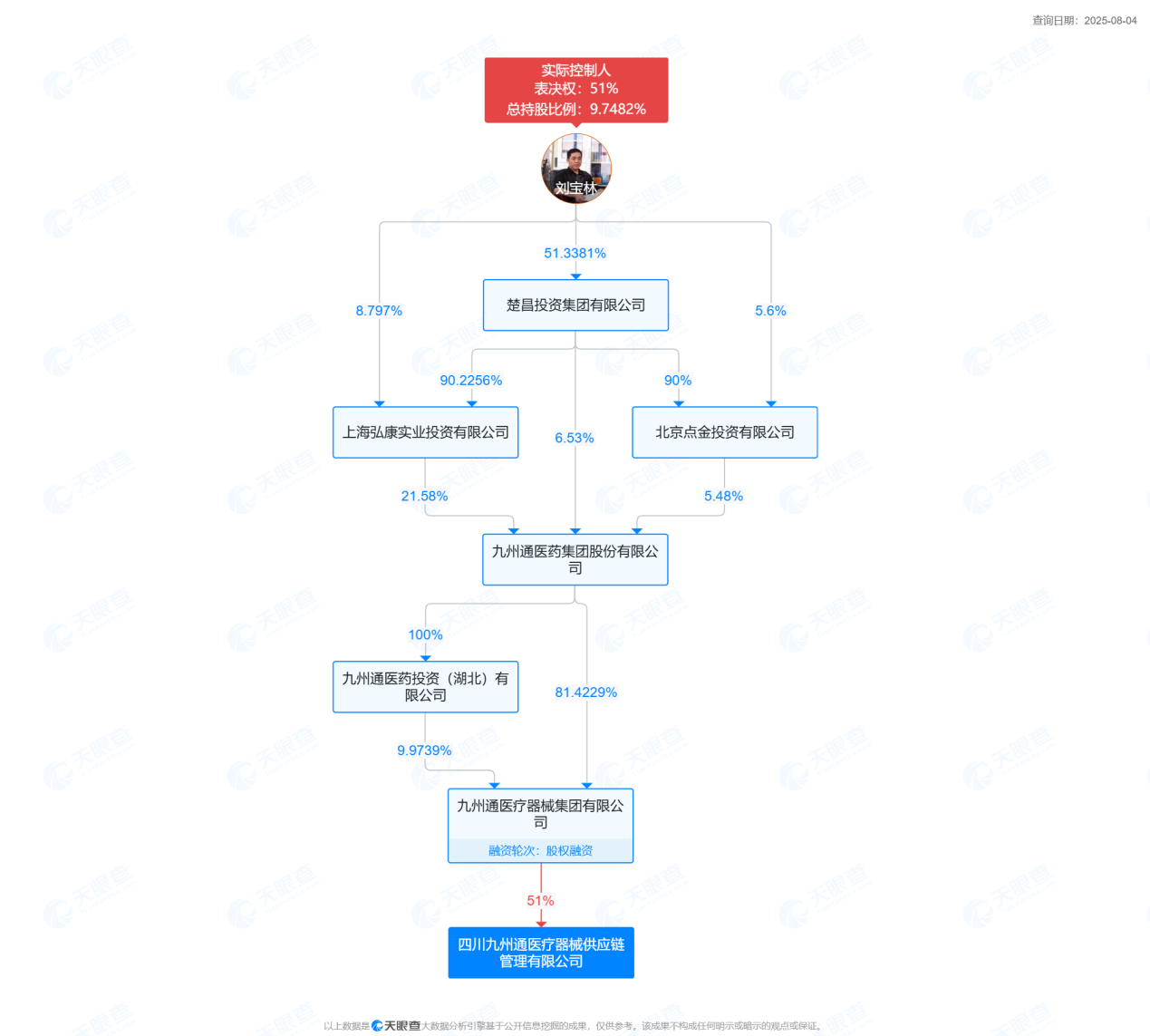 天眼查顯示,四川九州通醫(yī)療器械供應(yīng)鏈管理有限公司成立于2023年,注冊(cè)資本6000萬(wàn)元,是九州通醫(yī)藥集團(tuán)股份有限公司孫公司,也系楚昌投資集團(tuán)成員。