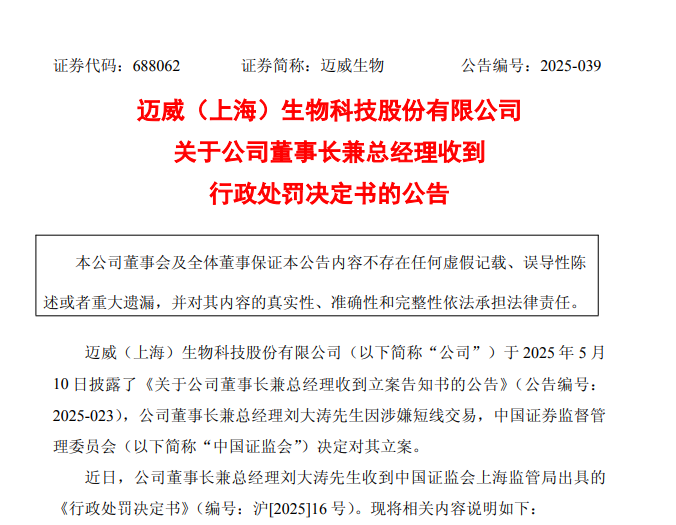 邁威生物董事長劉大濤因短線交易被警告并罰款六十萬元
