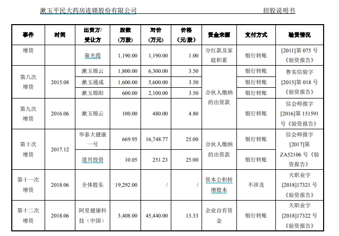“V觀財(cái)報(bào)”查閱漱玉平民招股書發(fā)現(xiàn),2018年6月,漱玉平民股東大會(huì)通過決議,同意將注冊(cè)資本增加至36480萬(wàn)元。新增的注冊(cè)資本3408萬(wàn)元由阿里健康以45440萬(wàn)元認(rèn)繳,全部為貨幣出資。本次增資的價(jià)格為13.33元/股。