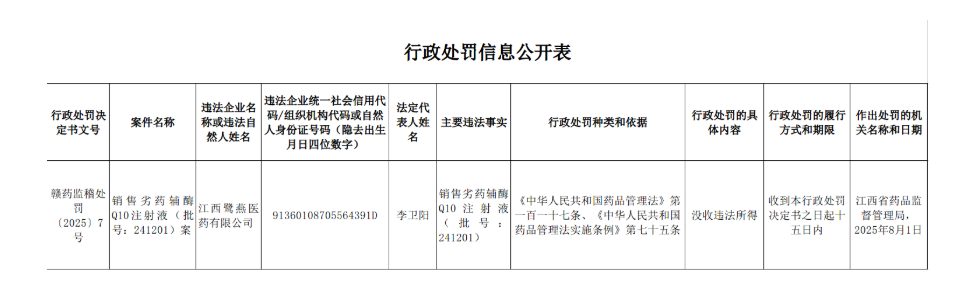 中國經(jīng)濟網(wǎng)北京811日訊(記者 郭文培) 江西省藥品監(jiān)督管理局日前披露的一則行政處罰信息顯示,江西鷺燕醫(yī)藥有限公司銷售劣藥輔酶Q10注射液(批號:241201)被江西省藥品監(jiān)督管理局沒收違法所得。