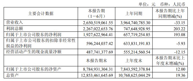 中國經濟網北京8月20日訊(記者 郭文培)日前,達仁堂披露2025年半年度報告。報告期內,公司實現營業(yè)收入26.51億元,同比下降33.15%;歸屬于上市公司股東的凈利潤為19.28億元,同比增長193.08%。