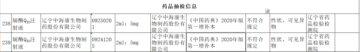 根據(jù)公告,該2批次不合格輔酶Q10注射液,標示生產(chǎn)企業(yè)為遼寧中海康生物制藥股份有限公司,生產(chǎn)批號為09250201、09241205,規(guī)格為2ml:5mg,不符合項目為性狀、可見異物。