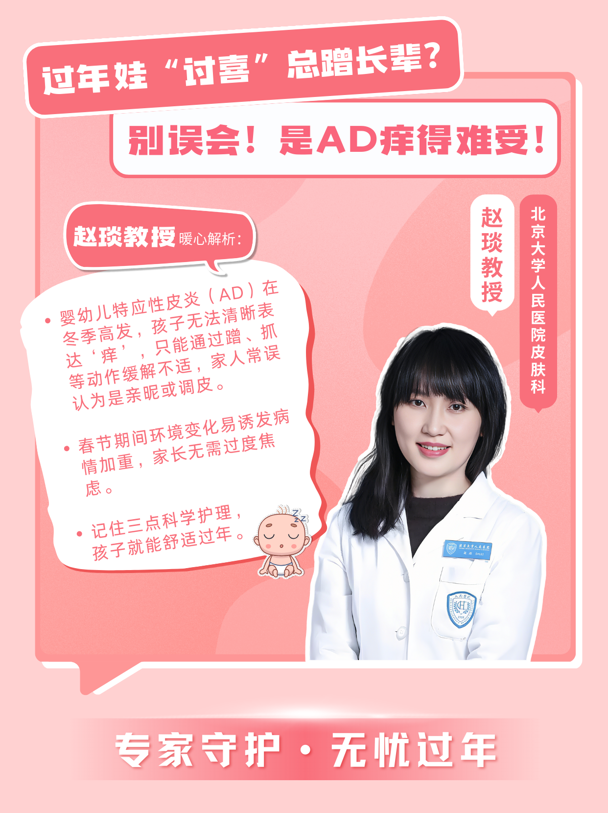 “嬰幼兒特應(yīng)性皮炎(AD)在冬季高發(fā),孩子無法清晰表達(dá)‘癢’,只能通過蹭、抓等動作緩解不適,家人常誤認(rèn)為是親昵或調(diào)皮。春節(jié)期間環(huán)境變化易誘發(fā)病情加重,家長無需過度焦慮,記住三點科學(xué)護(hù)理,孩子就能舒適過年: