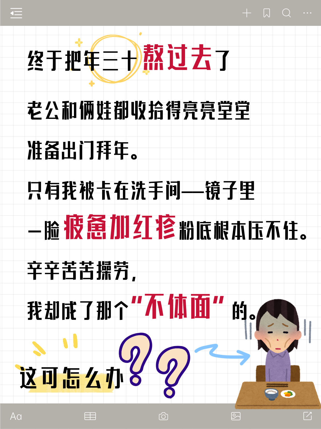只有我被卡在洗手間——鏡子里一臉疲憊加紅疹,粉底根本壓不住。