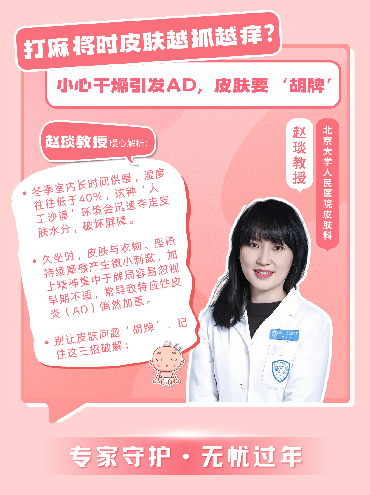 “冬季室內(nèi)長時間供暖,濕度往往低于40%,這種‘人工沙漠’環(huán)境會迅速奪走皮膚水分,破壞屏障。久坐時,皮膚與衣物、座椅持續(xù)摩擦產(chǎn)生微小刺激,加上精神集中于牌局容易忽視早期不適,常導(dǎo)致特應(yīng)性皮炎(AD)悄然加重。別讓皮膚問題‘胡牌’,記住這三招破解: