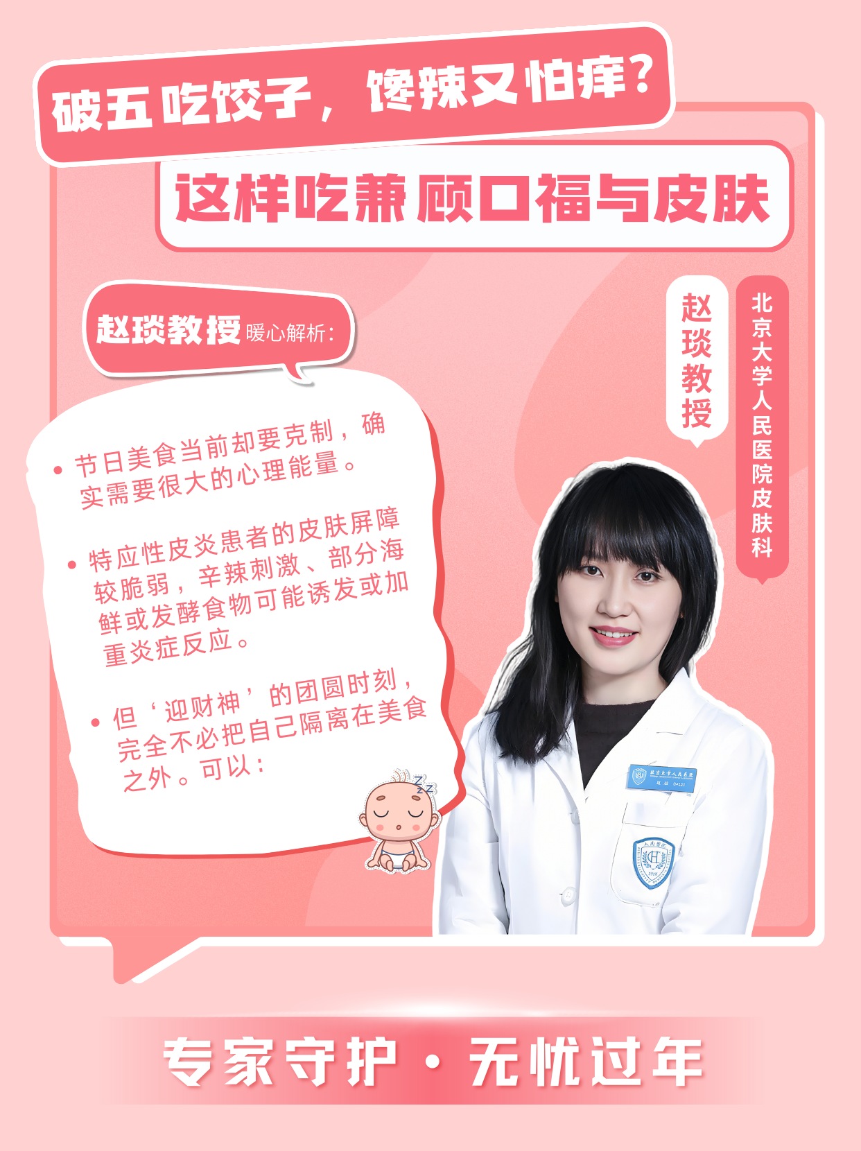 “節(jié)日美食當(dāng)前卻要克制,確實需要很大的心理能量。特應(yīng)性皮炎患者的皮膚屏障較脆弱,辛辣刺激、部分海鮮或發(fā)酵食物可能誘發(fā)或加重炎癥反應(yīng)。但‘迎財神’的團(tuán)圓時刻,完全不必把自己隔離在美食之外。”可以: