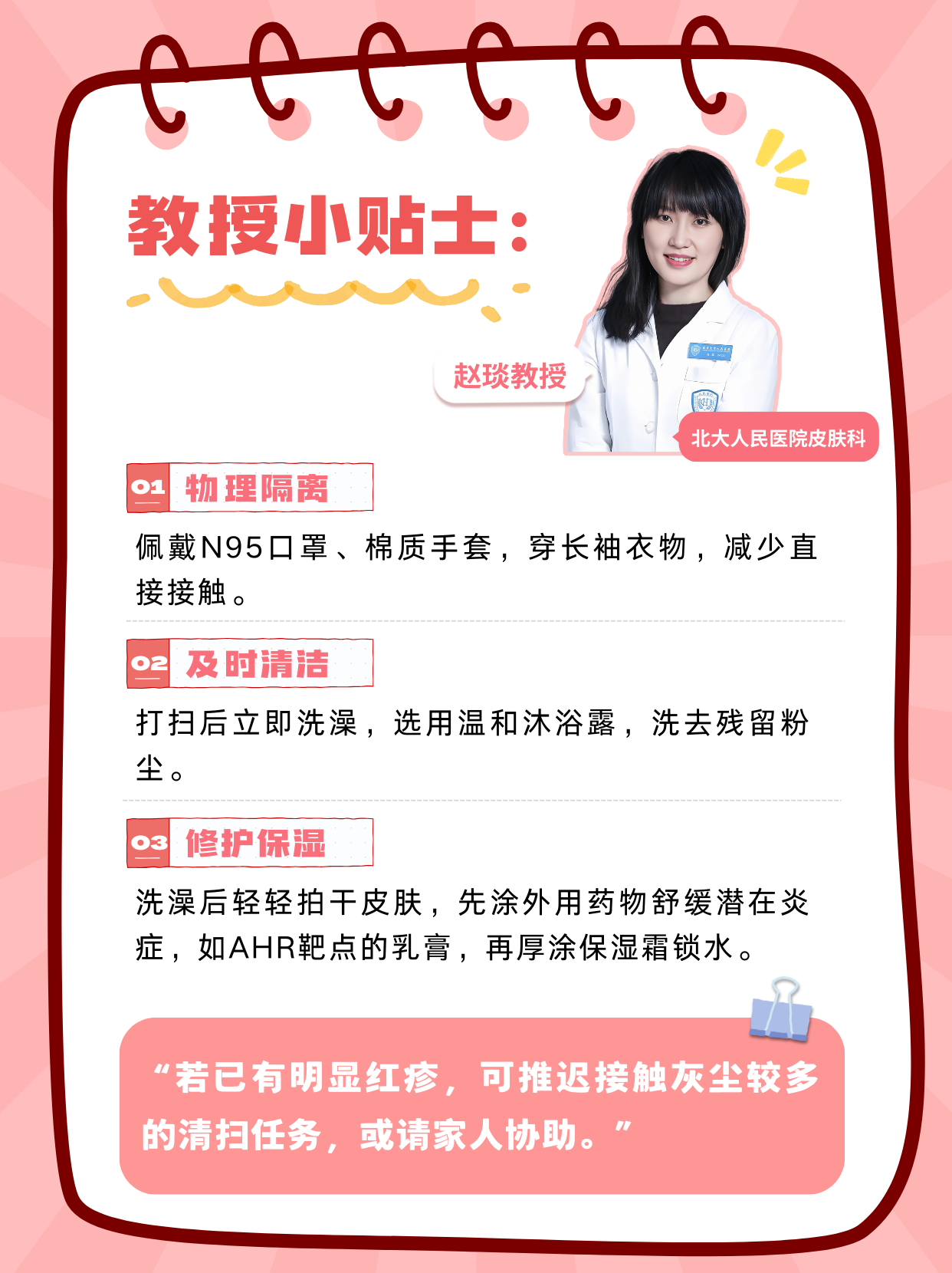 “若已有明顯紅疹,可推遲接觸灰塵較多的清掃任務(wù),或請家人協(xié)助?!?/p>
