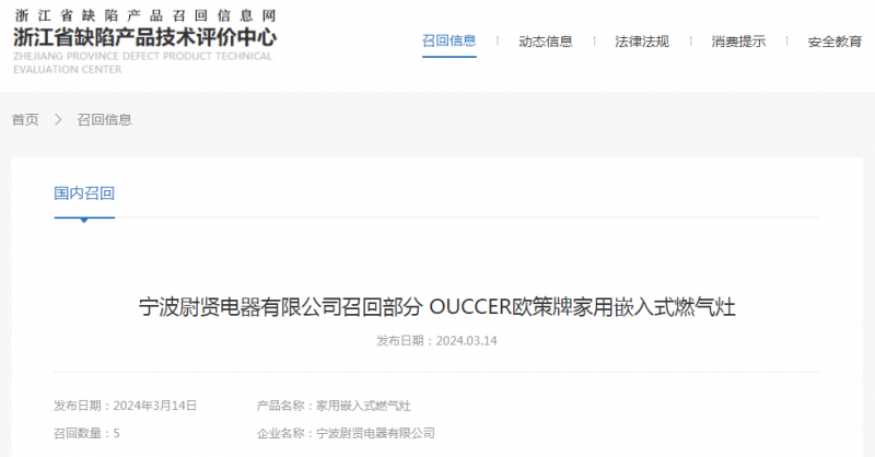 日前,寧波尉賢電器有限公司受缺陷調(diào)查影響按照《消費品召回管理暫行規(guī)定》的要求,主動向浙江省市場監(jiān)督管理局和寧波市市場監(jiān)督管理局報告了召回計劃,將自即日起,召回2023年3月1日期間制造的OUCCER歐策牌JZY-OC20型號家用嵌入式燃氣灶,涉及數(shù)量為5件。