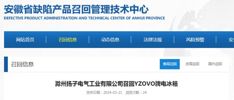 日前,滁州揚子電氣工業(yè)有限公司按照《消費品召回管理暫行規(guī)定》的要求,向安徽省市場監(jiān)督管理局、滁州市市場監(jiān)督管理局報告了召回計劃,將自即日起,召回2023年8月21日至2023年10月7日期間生產(chǎn)的YZOVO牌電冰箱(BCD-72P148),涉及數(shù)量為50臺。