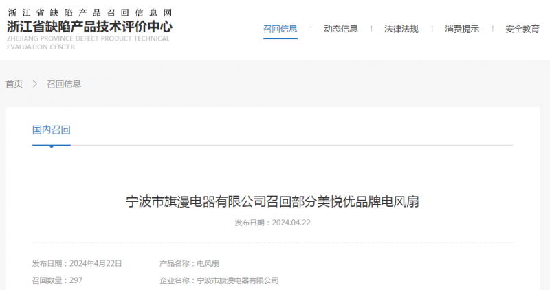 目前,寧波市旗漫電器有限公司受缺陷調(diào)查影響按照《消費(fèi)品召回管理暫行規(guī)定》的要求,主動向浙江省市場監(jiān)督管理局和寧波市市場監(jiān)督管理局報告了召回計劃,將自即日起,召回2023年5月22日至25日期間制造的部分美悅優(yōu)品牌型號QM-LD001電風(fēng)扇(循環(huán)扇),涉及數(shù)量297臺。
