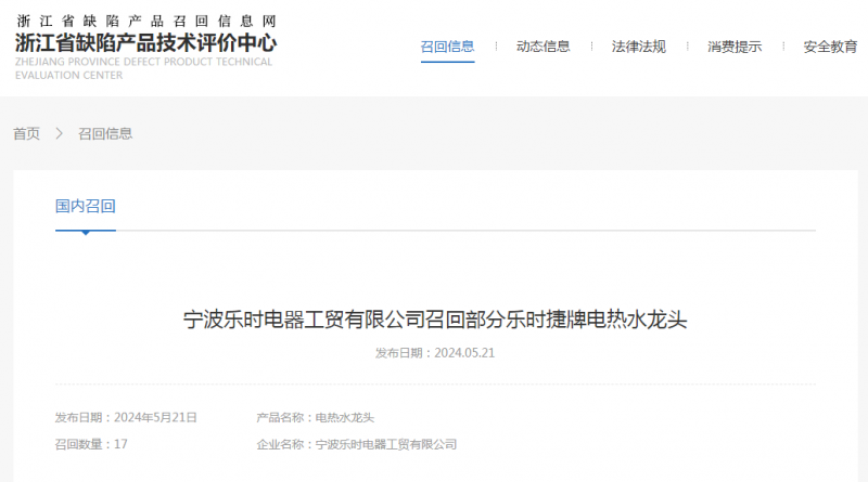 寧波樂時(shí)電器工貿(mào)有限公司召回部分樂時(shí)捷牌電熱水龍頭