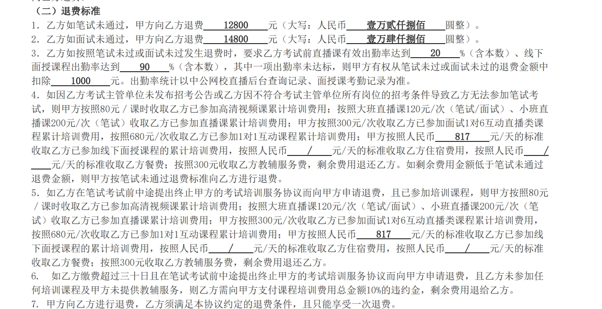 記者在武女士提供的其與中公教育簽訂的協(xié)議書(shū)里看到,符合出勤率等其他條件后,如果筆試或面試未通過(guò),中公教育將為學(xué)員全額退款。學(xué)員需在規(guī)定時(shí)間內(nèi)提交相關(guān)材料申請(qǐng)退費(fèi),中公教育核實(shí)所提交材料真實(shí)、符合退費(fèi)條件后,在30至45個(gè)工作日內(nèi)將約定的退費(fèi)金額支付至學(xué)員提供的銀行賬戶。