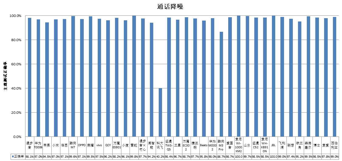 本次比較的36款無線耳機中,通話降噪能力出色的是索尼(WI-1000XM2)和JBL哈曼,接聽記錄錯誤率0%,通話降噪效果好,完全沒有受到噪聲影響,接聽語音非常清晰;2款無線耳機降噪能力比較弱,接聽記錄錯誤率超過10%,分別為科大訊飛和酷狗(酷狗M3 Pro)耳機,通話降噪欠佳的耳機在噪聲環(huán)境下,如地鐵、火車站、餐廳等地點通話,會導(dǎo)致對方收音不清晰,無法正常交流。